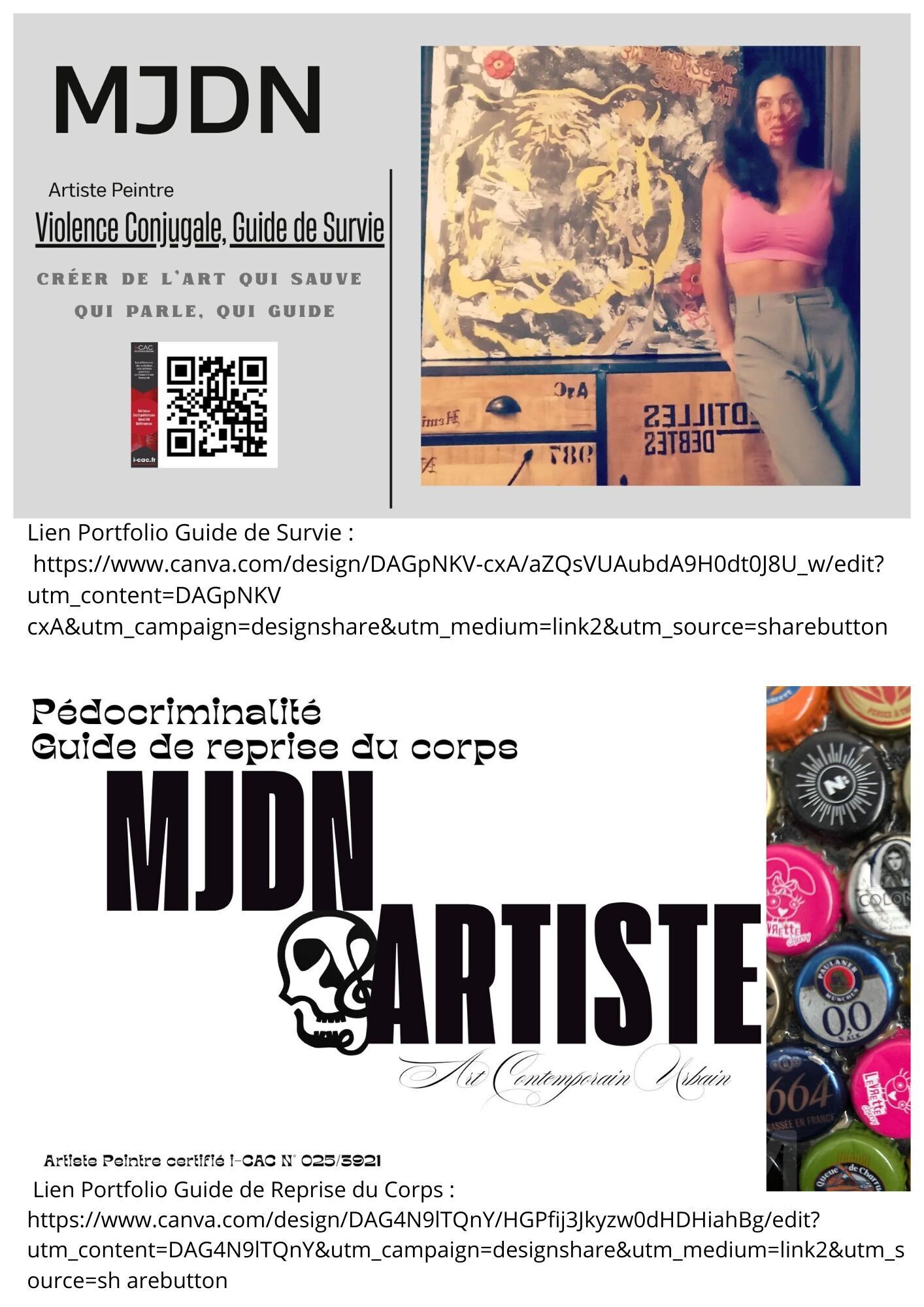 Découvrez une démarche artistique profondément engagée à travers deux portfolios percutants : le 'Guide de Survie Violence Conjugale' et le 'Guide de Reprise du Corps Pédocriminalité.